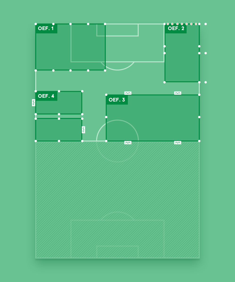 Noteer de afmetingen van de veldjes en maak groepen van minimaal 8 spelers. Na een centraal eindsignaal, draaien alle groepen met de klok mee naar de volgende oefening.