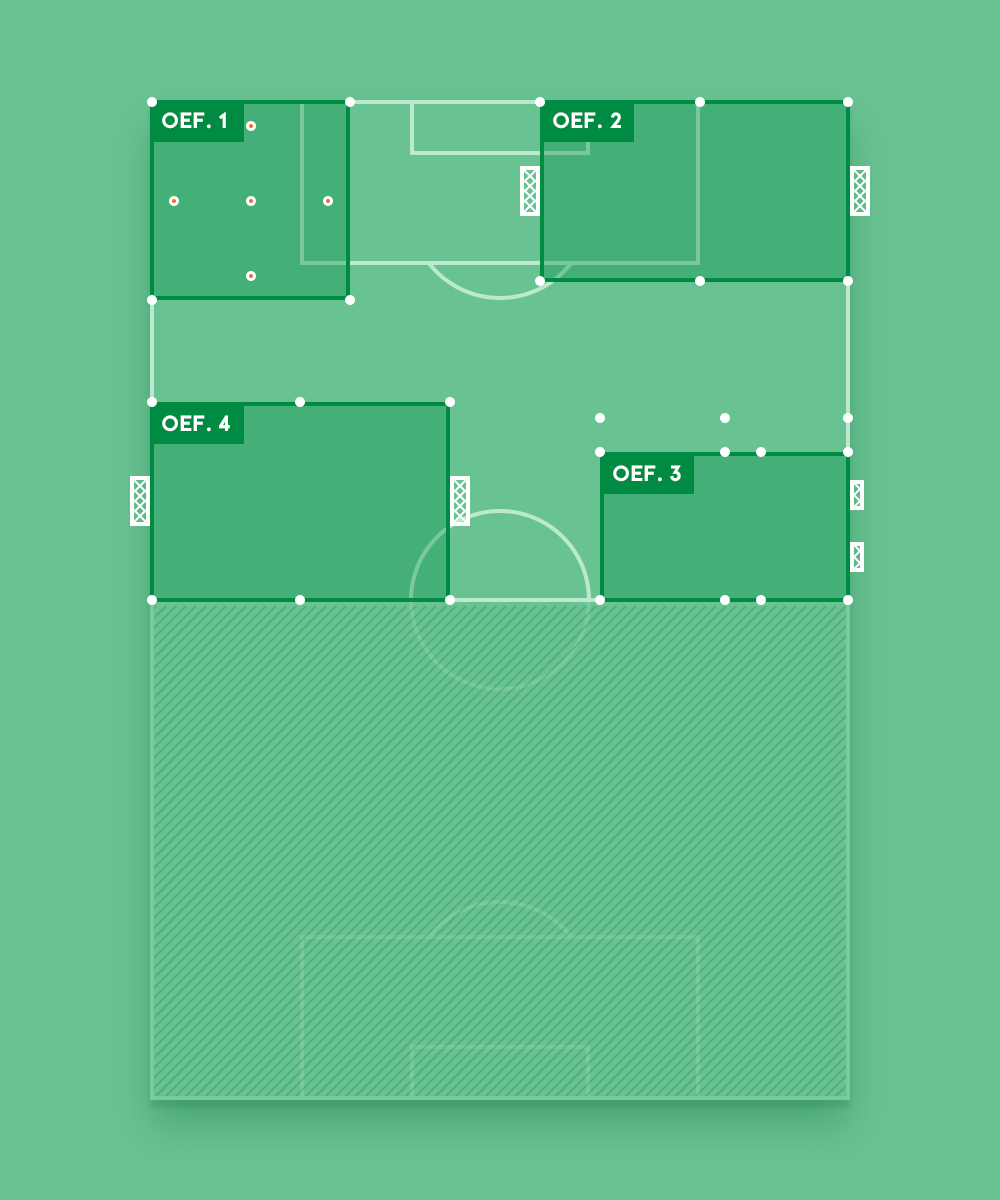 Noteer de afmetingen van de veldjes en maak groepen van minimaal 8 spelers. Na een centraal eindsignaal, draaien alle groepen met de klok mee naar de volgende oefening.