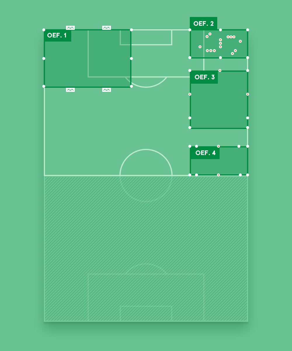 Noteer de afmetingen van de veldjes en maak groepen van minimaal 8 spelers. Na een centraal eindsignaal, draaien alle groepen met de klok mee naar de volgende oefening.