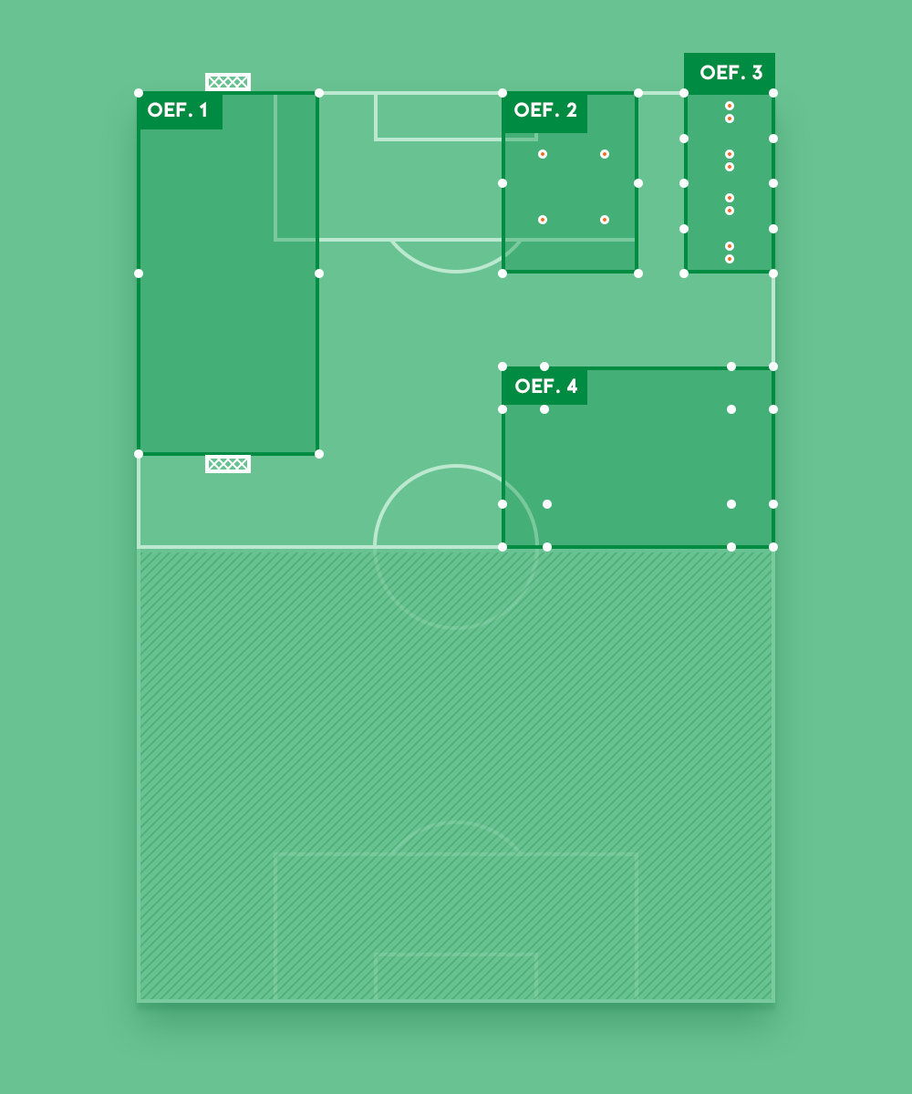 Noteer de afmetingen van de veldjes en maak groepen van minimaal 8 spelers. Na een centraal eindsignaal, draaien alle groepen met de klok mee naar de volgende oefening.
