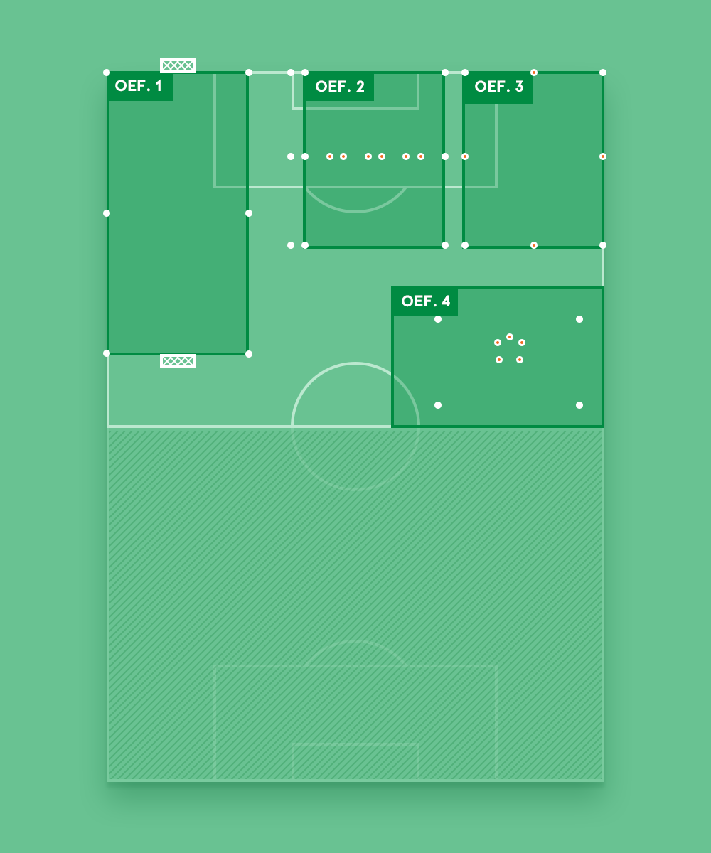 Noteer de afmetingen van de veldjes en maak groepen van minimaal 8 spelers. Na een centraal eindsignaal, draaien alle groepen met de klok mee naar de volgende oefening.