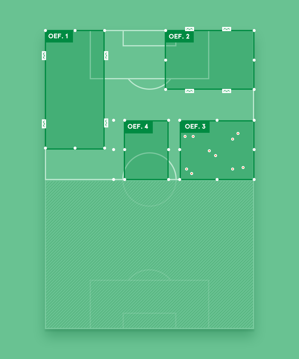 Noteer de afmetingen van de veldjes en maak groepen van minimaal 8 spelers. Na een centraal eindsignaal, draaien alle groepen met de klok mee naar de volgende oefening.