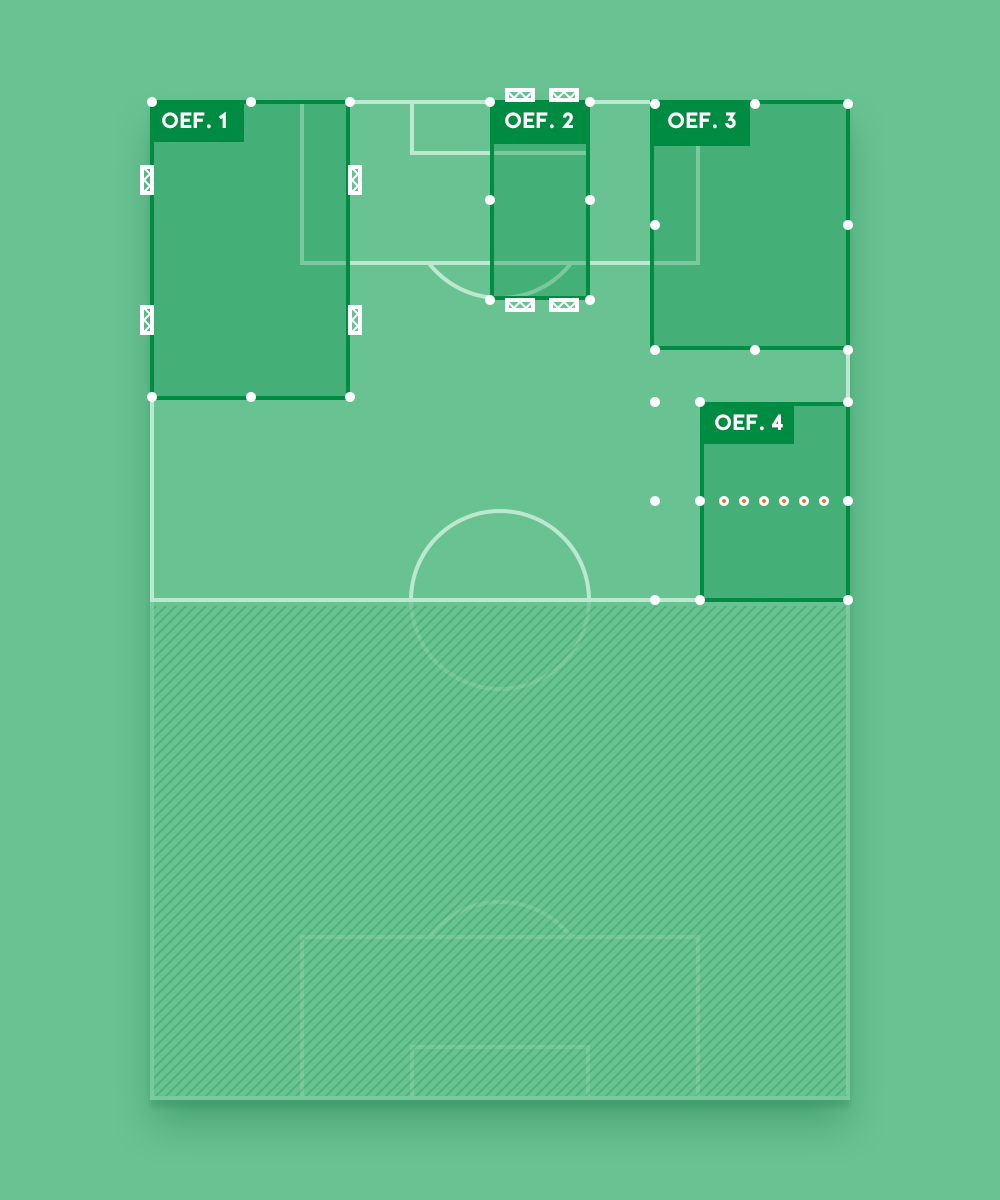 Noteer de afmetingen van de veldjes en maak groepen van minimaal 8 spelers. Na een centraal eindsignaal, draaien alle groepen met de klok mee naar de volgende oefening.