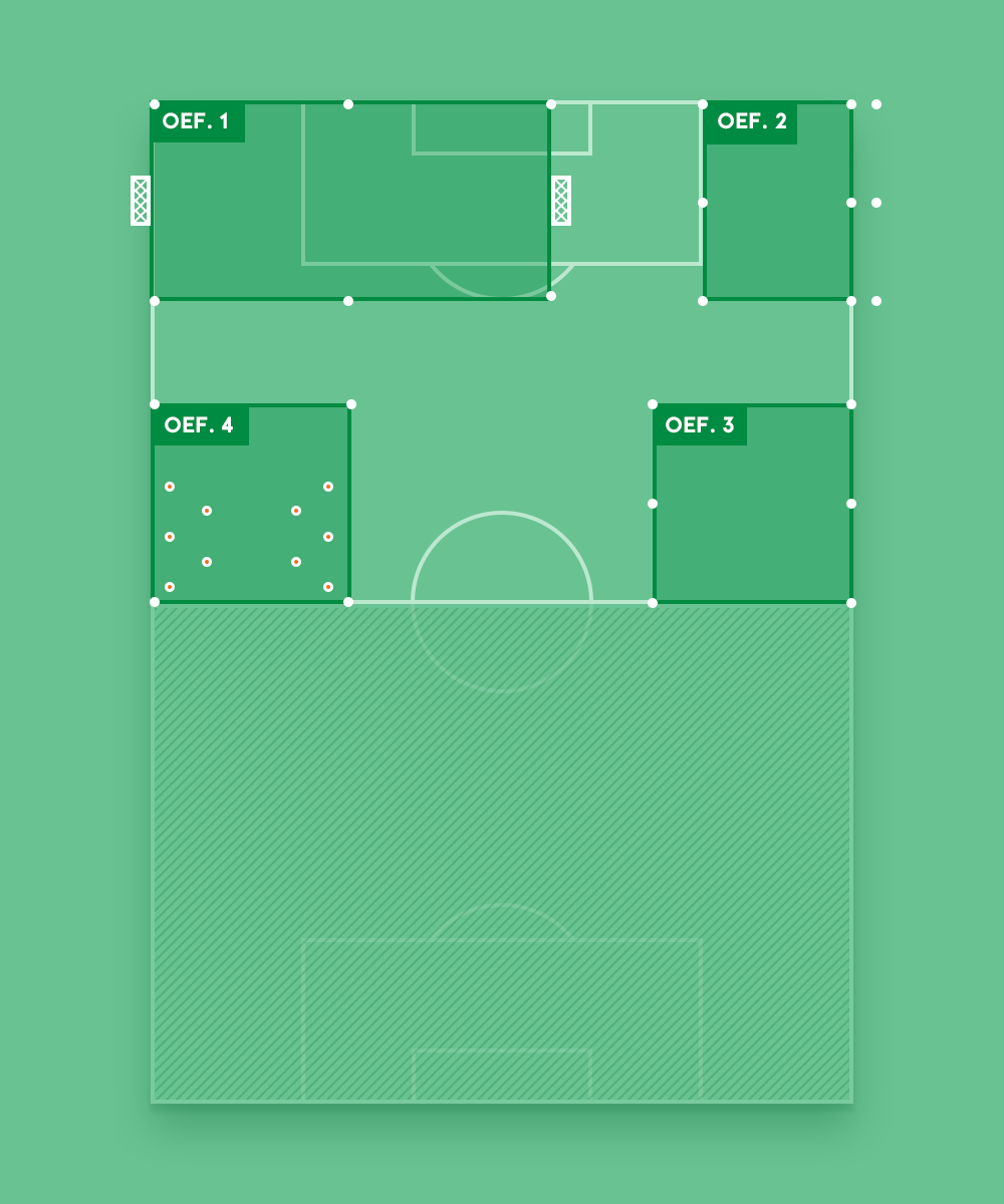 Noteer de afmetingen van de veldjes en maak groepen van minimaal 8 spelers. Na een centraal eindsignaal, draaien alle groepen met de klok mee naar de volgende oefening.