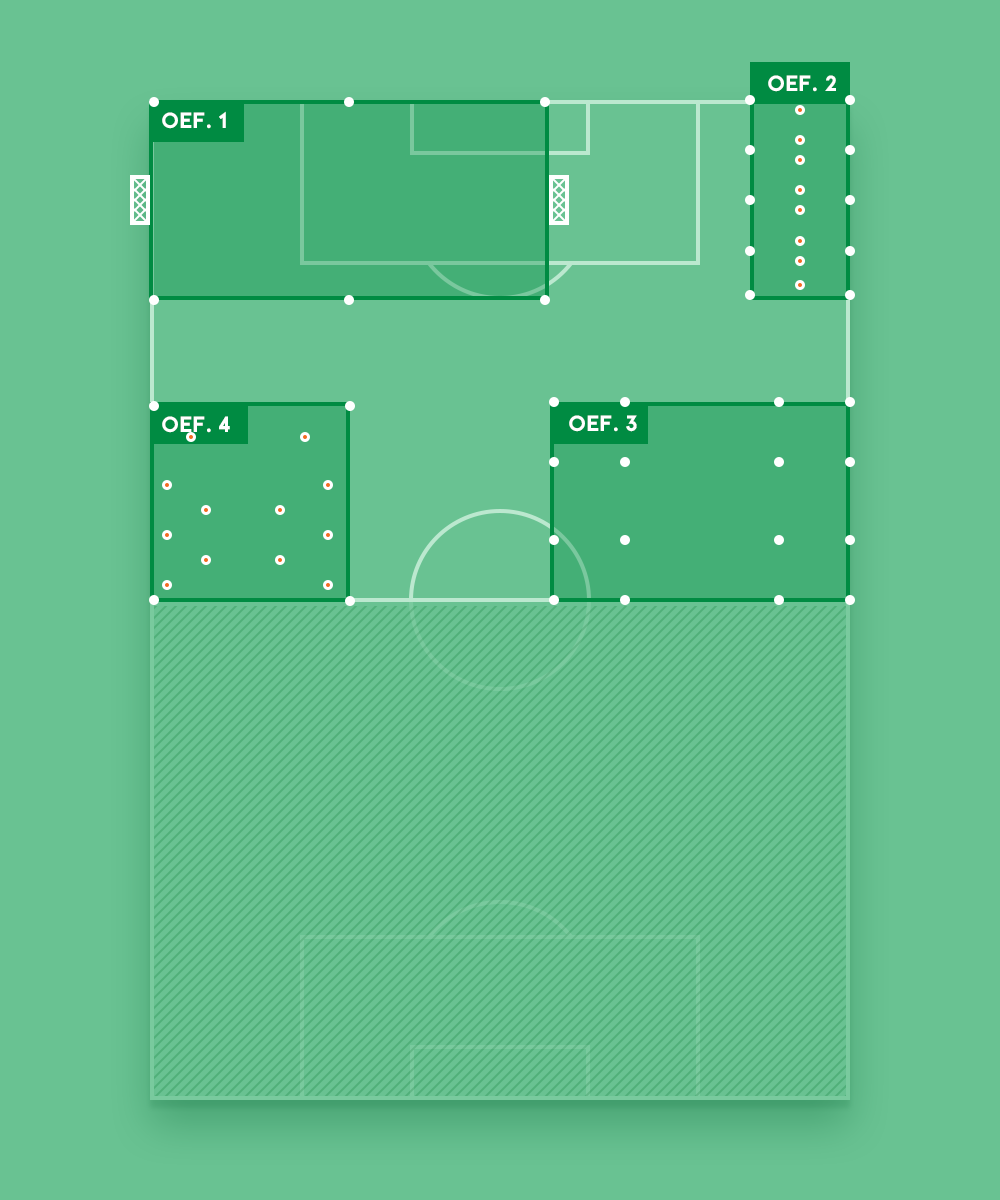 Noteer de afmetingen van de veldjes en maak groepen van minimaal 8 spelers. Na een centraal eindsignaal, draaien alle groepen met de klok mee naar de volgende oefening.