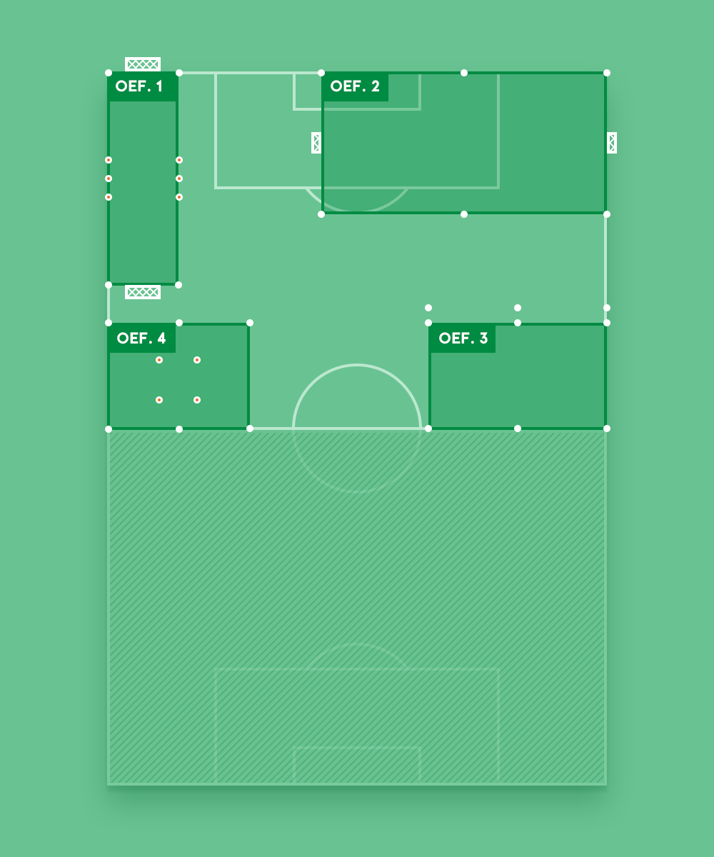 Noteer de afmetingen van de veldjes en maak groepen van minimaal 8 spelers. Na een centraal eindsignaal, draaien alle groepen met de klok mee naar de volgende oefening.