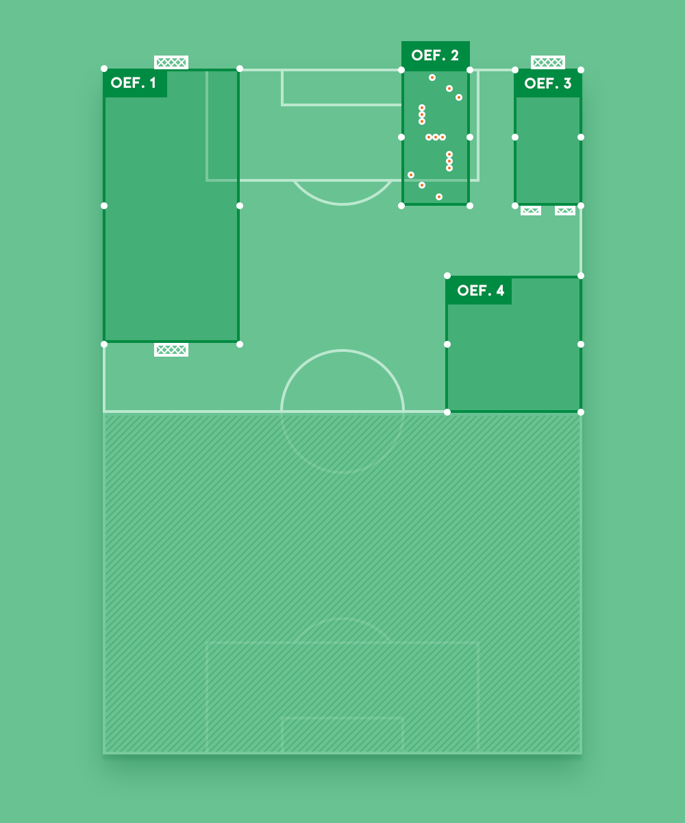 Noteer de afmetingen van de veldjes en maak groepen van minimaal 8 spelers. Na een centraal eindsignaal, draaien alle groepen met de klok mee naar de volgende oefening.