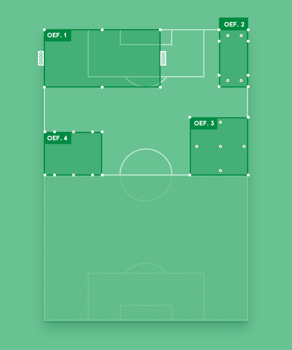 Noteer de afmetingen van de veldjes en maak groepen van minimaal 8 spelers. Na een centraal eindsignaal, draaien alle groepen met de klok mee naar de volgende oefening.
