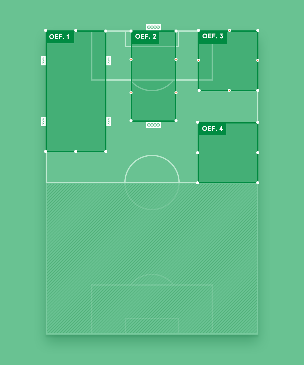 Noteer de afmetingen van de veldjes en maak groepen van minimaal 8 spelers. Na een centraal eindsignaal, draaien alle groepen met de klok mee naar de volgende oefening.