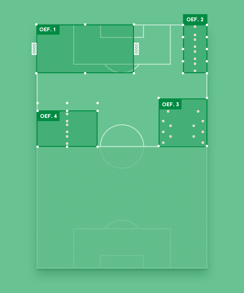 Noteer de afmetingen van de veldjes en maak groepen van minimaal 8 spelers. Na een centraal eindsignaal, draaien alle groepen met de klok mee naar de volgende oefening.