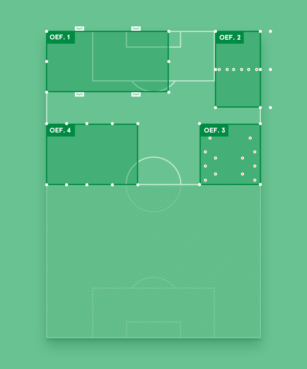 Noteer de afmetingen van de veldjes en maak groepen van minimaal 8 spelers. Na een centraal eindsignaal, draaien alle groepen met de klok mee naar de volgende oefening.
