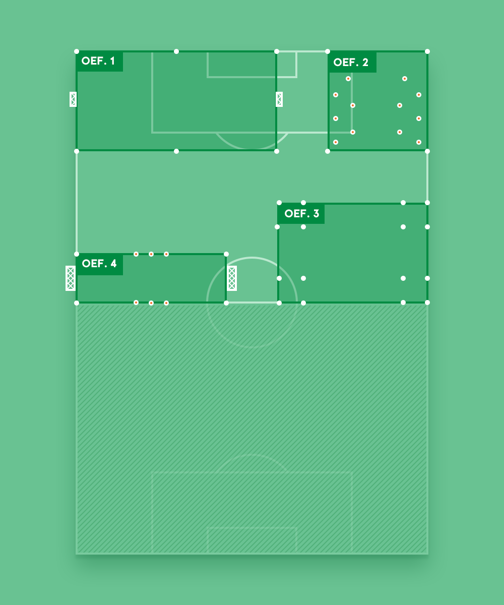 Noteer de afmetingen van de veldjes en maak groepen van minimaal 8 spelers. Na een centraal eindsignaal, draaien alle groepen met de klok mee naar de volgende oefening.