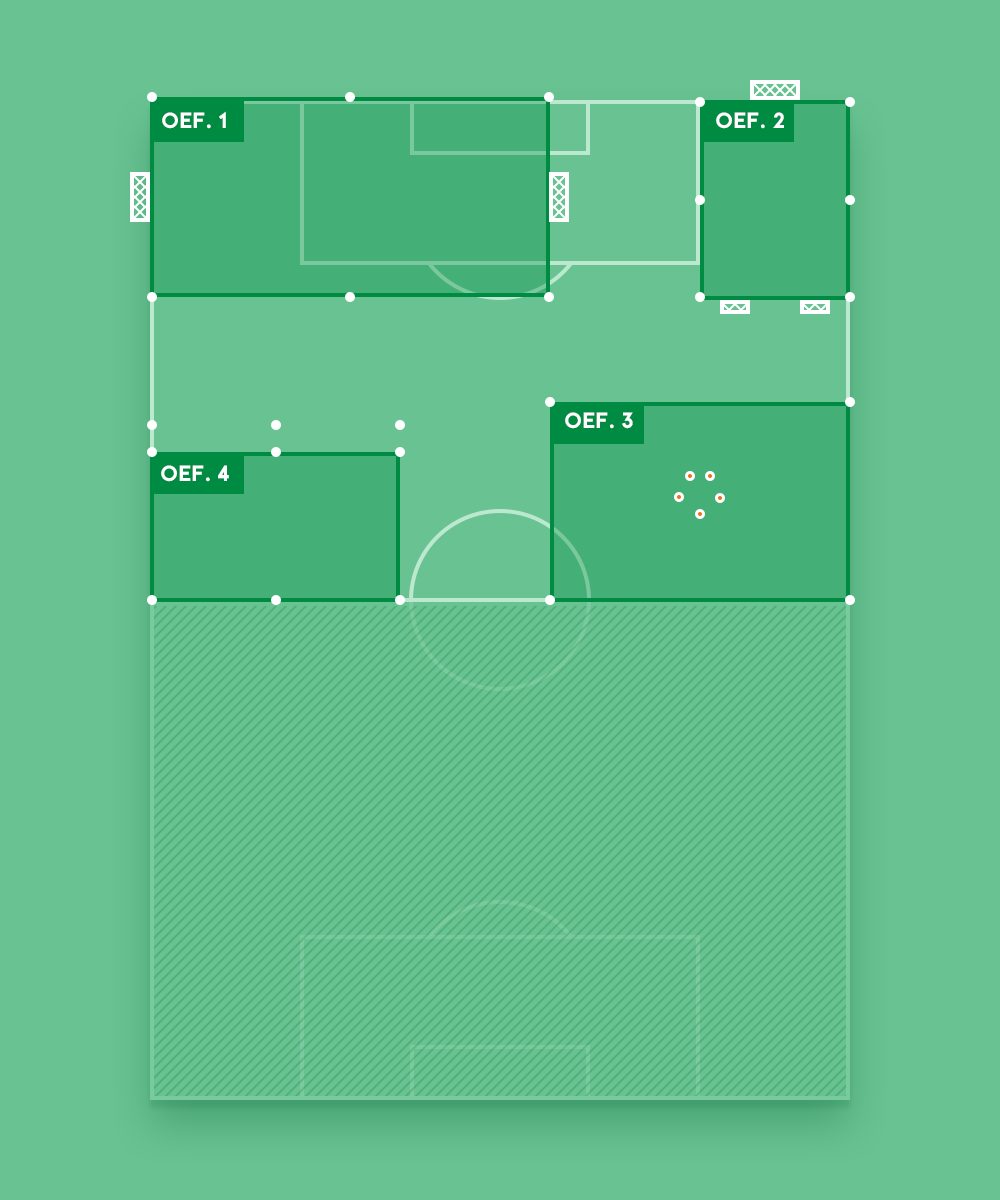 Noteer de afmetingen van de veldjes en maak groepen van minimaal 8 spelers. Na een centraal eindsignaal, draaien alle groepen met de klok mee naar de volgende oefening.
