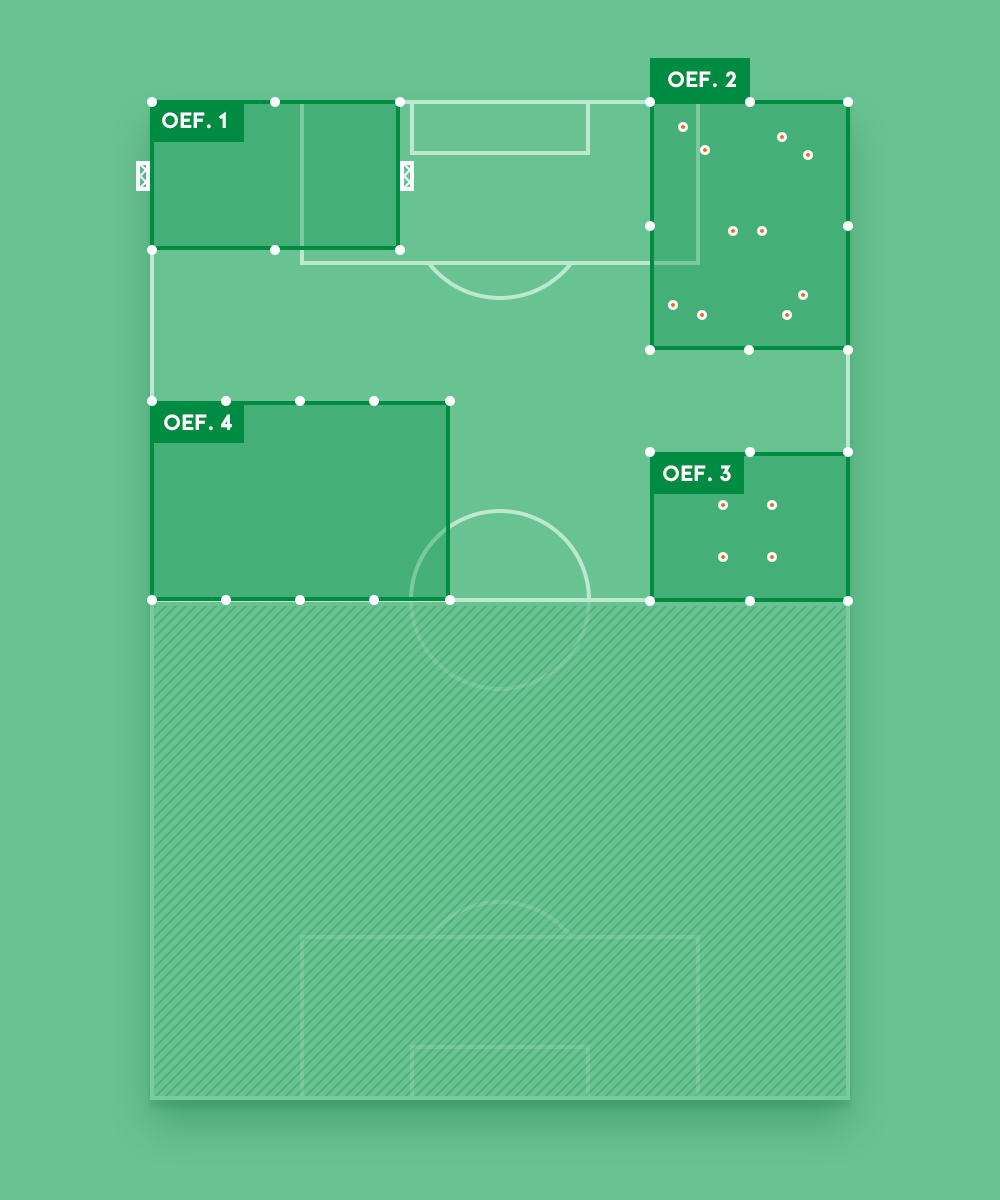 Noteer de afmetingen van de veldjes en maak groepen van minimaal 6 spelers. Na een centraal eindsignaal, draaien alle groepen met de klok mee naar de volgende oefening.
