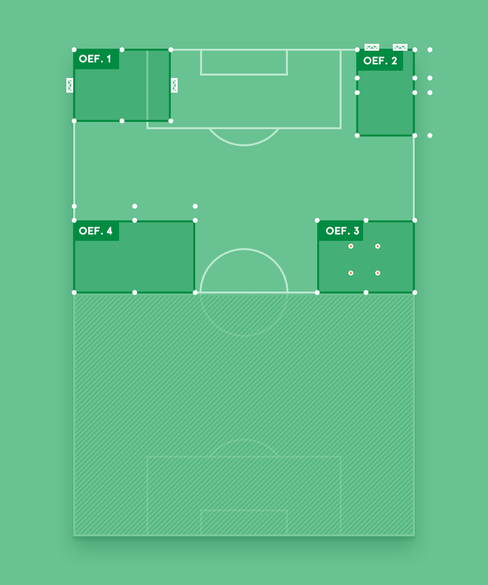 Noteer de afmetingen van de veldjes en maak groepen van minimaal 6 spelers. Na een centraal eindsignaal, draaien alle groepen met de klok mee naar de volgende oefening.