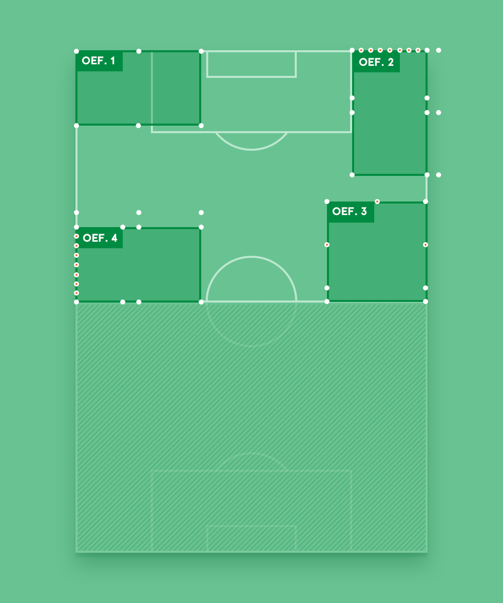 Noteer de afmetingen van de veldjes en maak groepen van minimaal 6 spelers. Na een centraal eindsignaal, draaien alle groepen met de klok mee naar de volgende oefening.