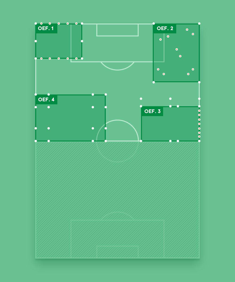 Noteer de afmetingen van de veldjes en maak groepen van minimaal 6 spelers. Na een centraal eindsignaal, draaien alle groepen met de klok mee naar de volgende oefening.