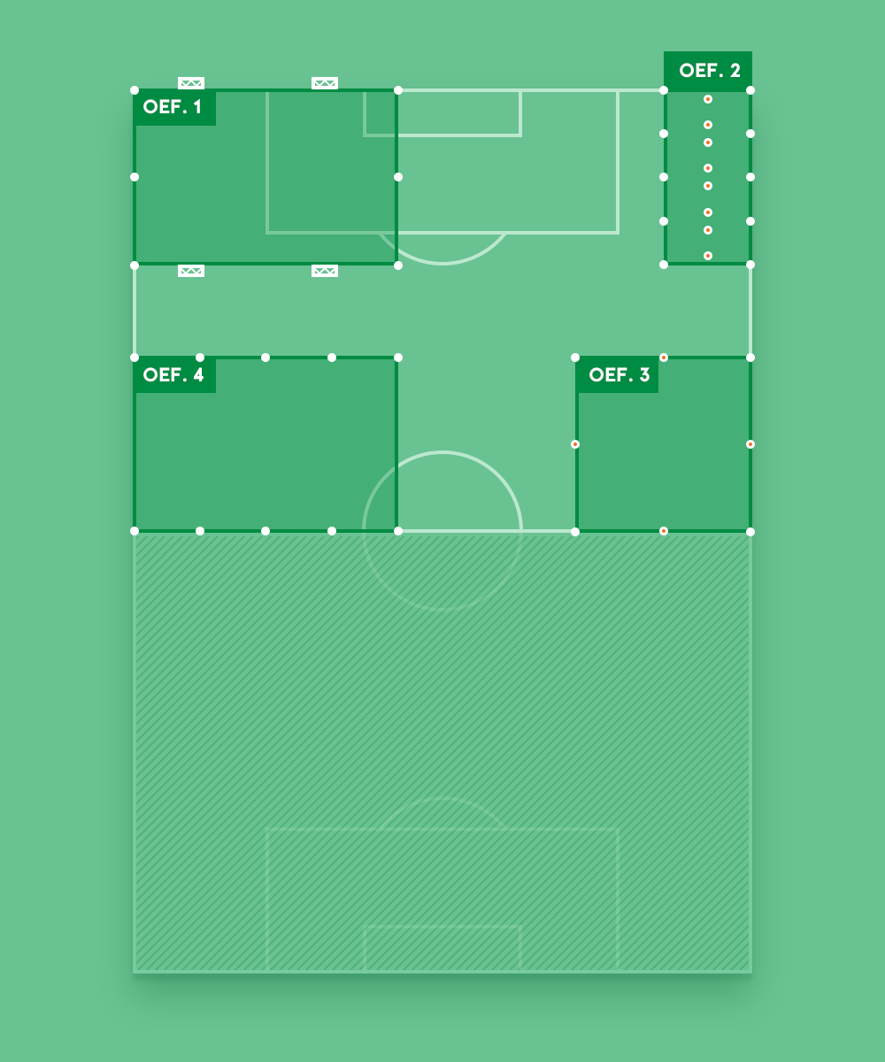 Noteer de afmetingen van de veldjes en maak groepen van minimaal 6 spelers. Na een centraal eindsignaal, draaien alle groepen met de klok mee naar de volgende oefening.