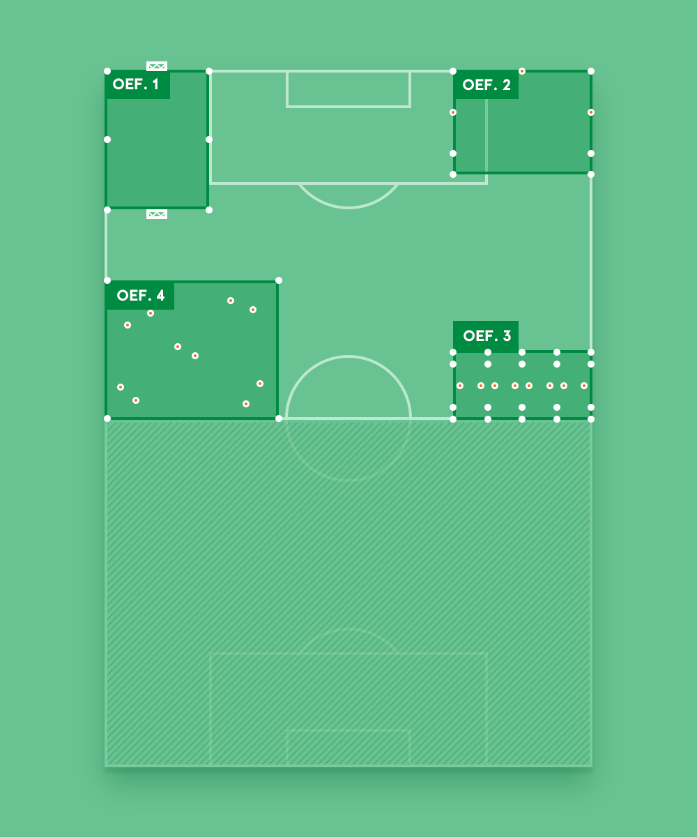 Noteer de afmetingen van de veldjes en maak groepen van minimaal 6 spelers. Na een centraal eindsignaal, draaien alle groepen met de klok mee naar de volgende oefening.