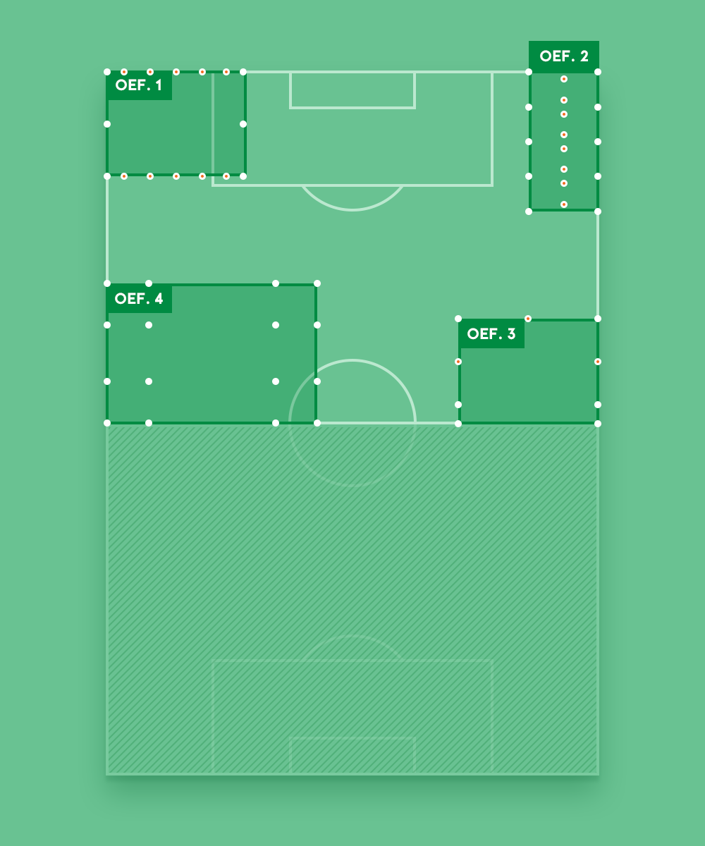 Noteer de afmetingen van de veldjes en maak groepen van minimaal 6 spelers. Na een centraal eindsignaal, draaien alle groepen met de klok mee naar de volgende oefening.