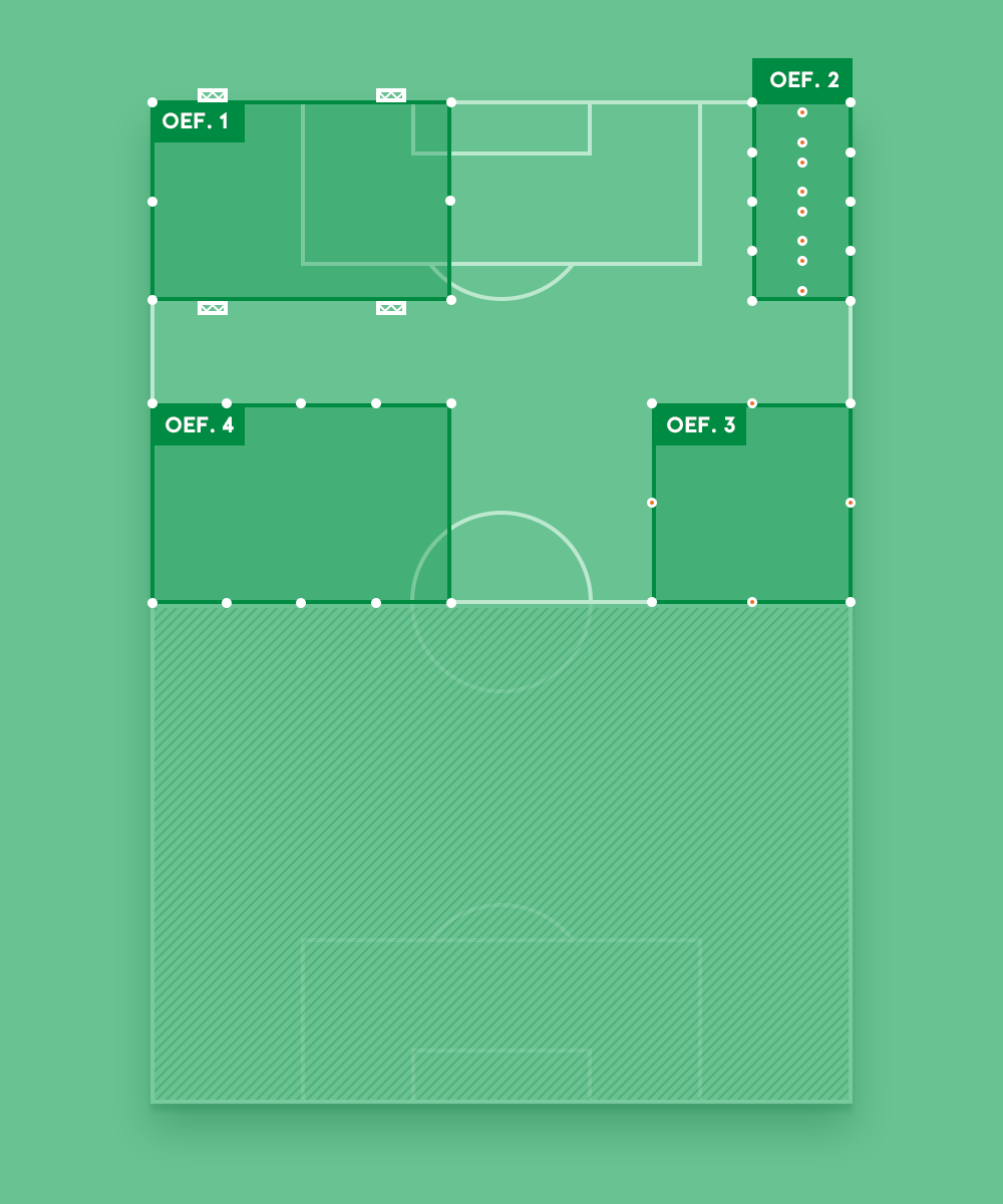 Noteer de afmetingen van de veldjes en maak groepen van minimaal 6 spelers. Na een centraal eindsignaal, draaien alle groepen met de klok mee naar de volgende oefening.
