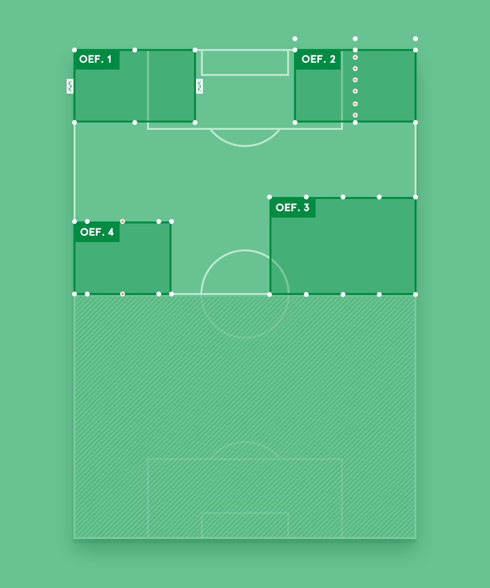 Noteer de afmetingen van de veldjes en maak groepen van minimaal 6 spelers. Na een centraal eindsignaal, draaien alle groepen met de klok mee naar de volgende oefening.