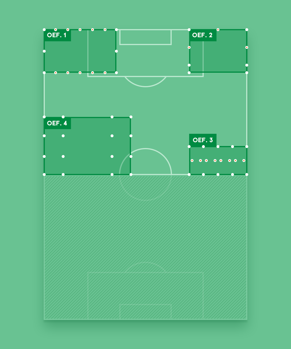 Noteer de afmetingen van de veldjes en maak groepen van minimaal 6 spelers. Na een centraal eindsignaal, draaien alle groepen met de klok mee naar de volgende oefening.