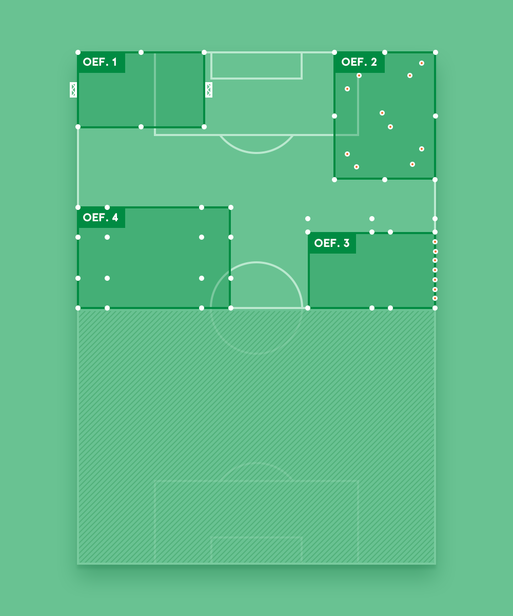 Noteer de afmetingen van de veldjes en maak groepen van minimaal 6 spelers. Na een centraal eindsignaal, draaien alle groepen met de klok mee naar de volgende oefening.