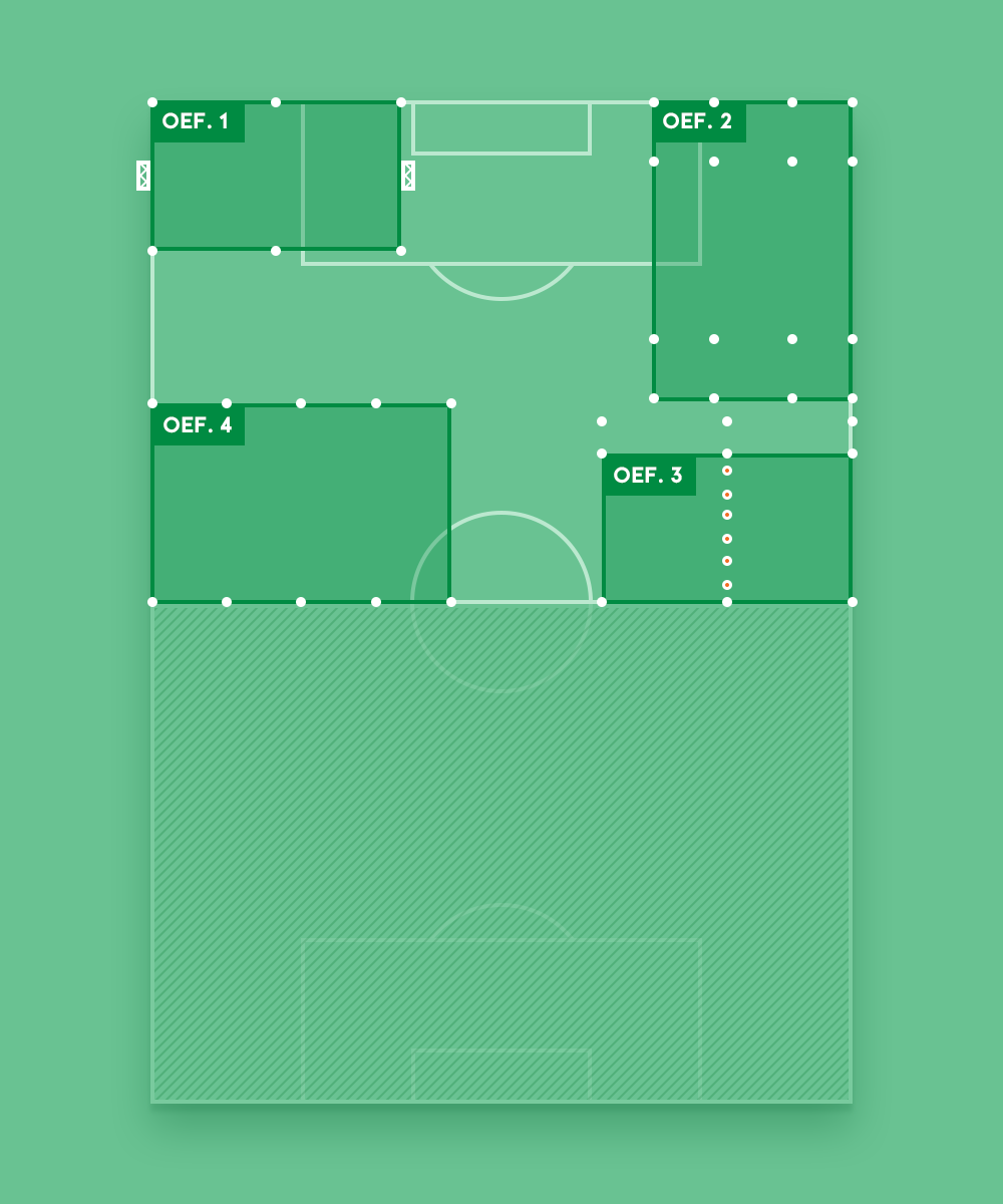 Noteer de afmetingen van de veldjes en maak groepen van minimaal 6 spelers. Na een centraal eindsignaal, draaien alle groepen met de klok mee naar de volgende oefening.