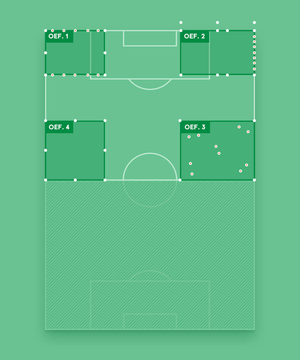 Noteer de afmetingen van de veldjes en maak groepen van minimaal 6 spelers. Na een centraal eindsignaal, draaien alle groepen met de klok mee naar de volgende oefening.