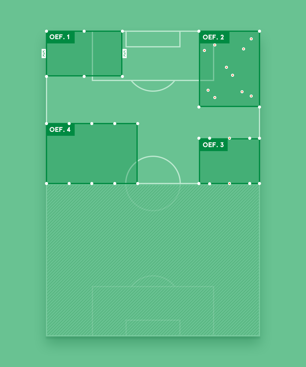 Noteer de afmetingen van de veldjes en maak groepen van minimaal 6 spelers. Na een centraal eindsignaal, draaien alle groepen met de klok mee naar de volgende oefening.