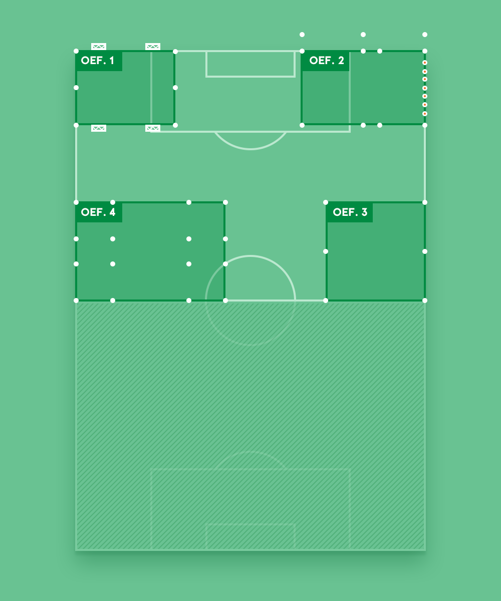 Noteer de afmetingen van de veldjes en maak groepen van minimaal 6 spelers. Na een centraal eindsignaal, draaien alle groepen met de klok mee naar de volgende oefening.