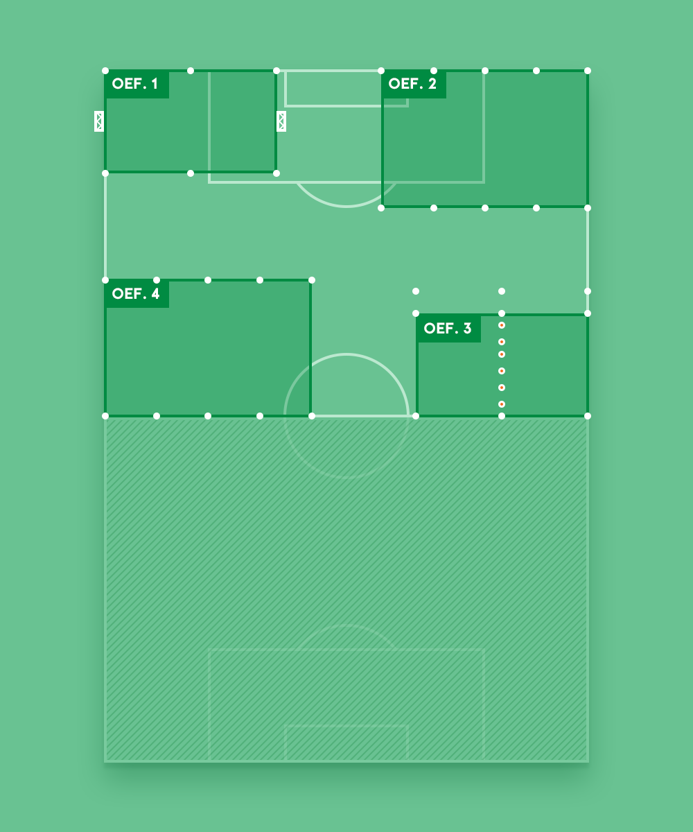 Noteer de afmetingen van de veldjes en maak groepen van minimaal 6 spelers. Na een centraal eindsignaal, draaien alle groepen met de klok mee naar de volgende oefening.