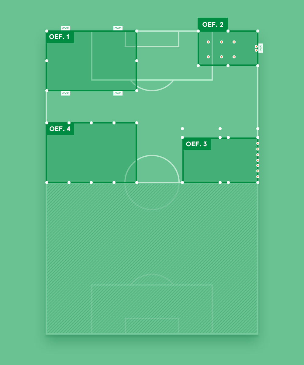 Noteer de afmetingen van de veldjes en maak groepen van minimaal 6 spelers. Na een centraal eindsignaal, draaien alle groepen met de klok mee naar de volgende oefening.