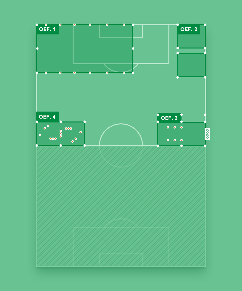 Noteer de afmetingen van de veldjes en maak groepen van minimaal 8 spelers. Na een centraal eindsignaal, draaien alle groepen met de klok mee naar de volgende oefening.