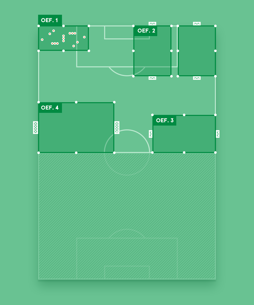 Noteer de afmetingen van de veldjes en maak groepen van minimaal 8 spelers. Na een centraal eindsignaal, draaien alle groepen met de klok mee naar de volgende oefening.
