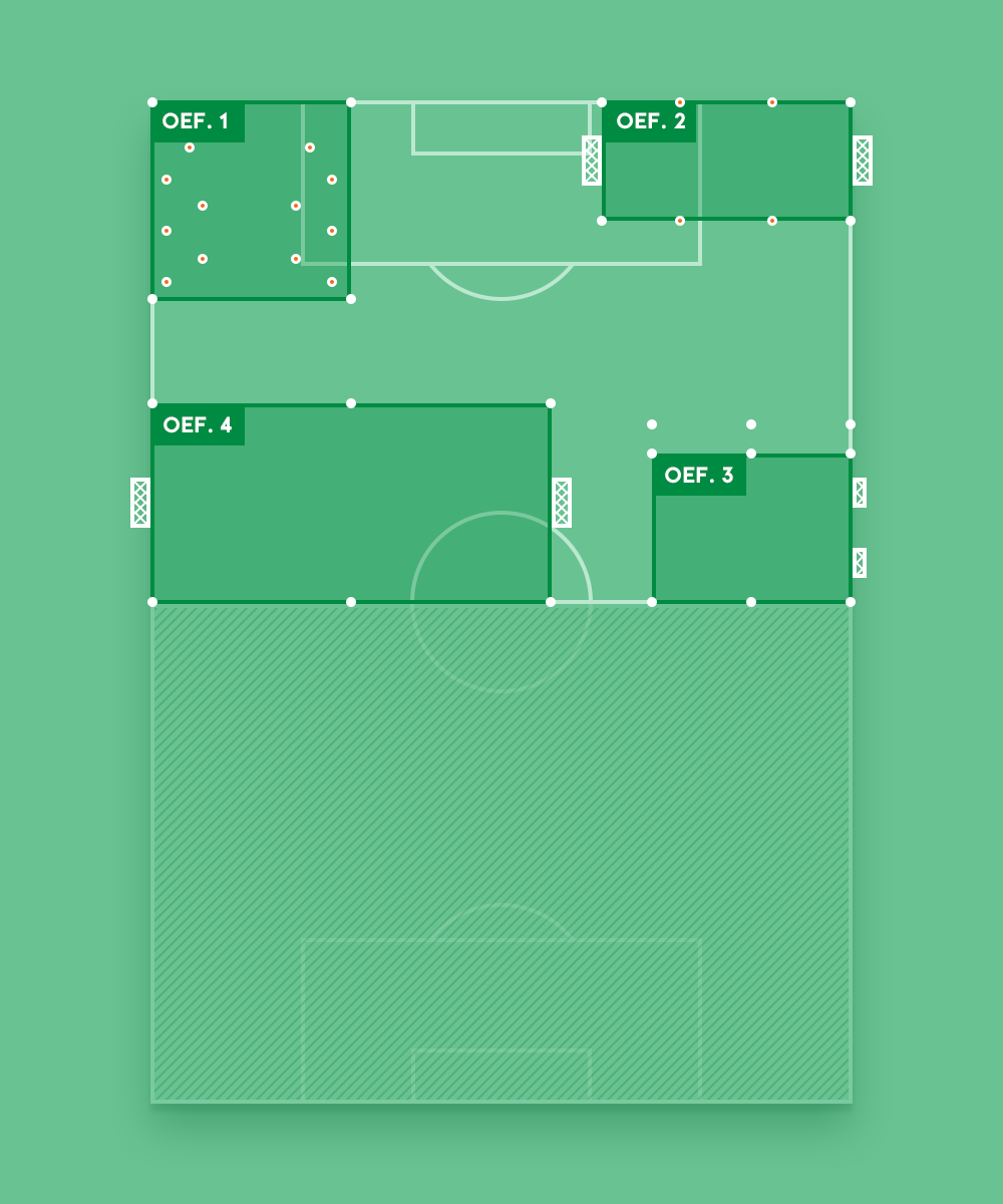 Noteer de afmetingen van de veldjes en maak groepen van minimaal 8 spelers. Na een centraal eindsignaal, draaien alle groepen met de klok mee naar de volgende oefening.