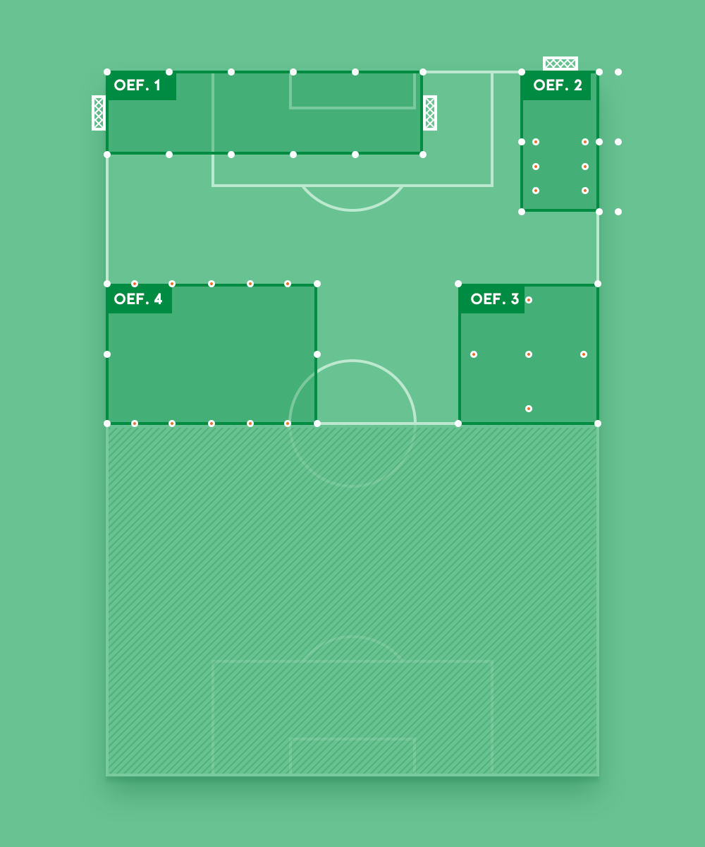 Noteer de afmetingen van de veldjes en maak groepen van minimaal 8 spelers. Na een centraal eindsignaal, draaien alle groepen met de klok mee naar de volgende oefening.