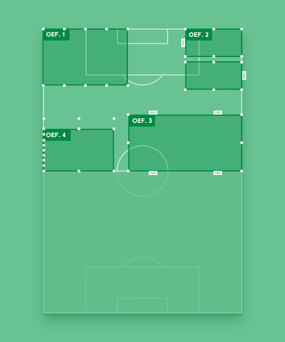 Noteer de afmetingen van de veldjes en maak groepen van minimaal 8 spelers. Na een centraal eindsignaal, draaien alle groepen met de klok mee naar de volgende oefening.