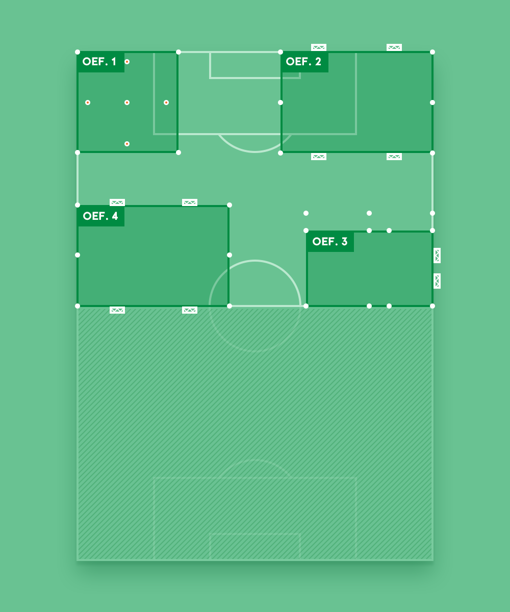 Noteer de afmetingen van de veldjes en maak groepen van minimaal 8 spelers. Na een centraal eindsignaal, draaien alle groepen met de klok mee naar de volgende oefening.