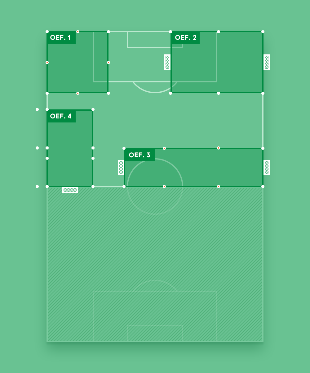 Noteer de afmetingen van de veldjes en maak groepen van minimaal 8 spelers. Na een centraal eindsignaal, draaien alle groepen met de klok mee naar de volgende oefening.