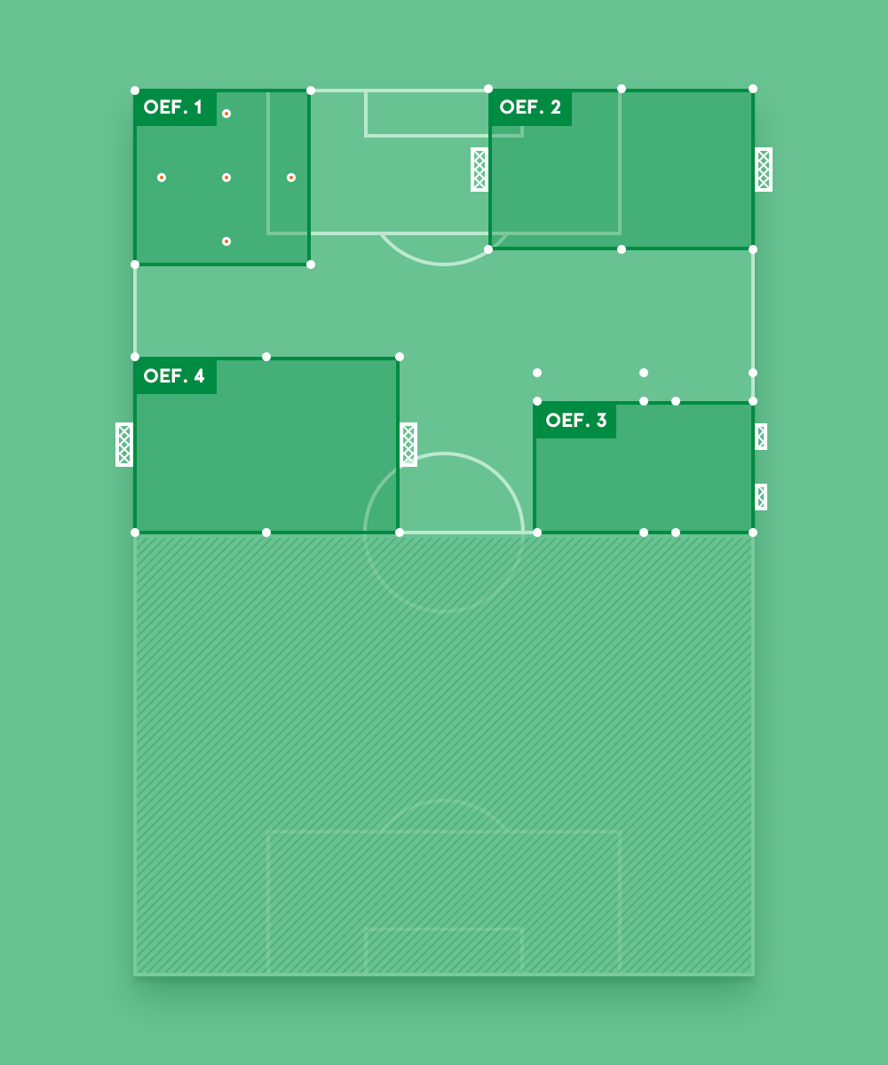 Noteer de afmetingen van de veldjes en maak groepen van minimaal 8 spelers. Na een centraal eindsignaal, draaien alle groepen met de klok mee naar de volgende oefening.