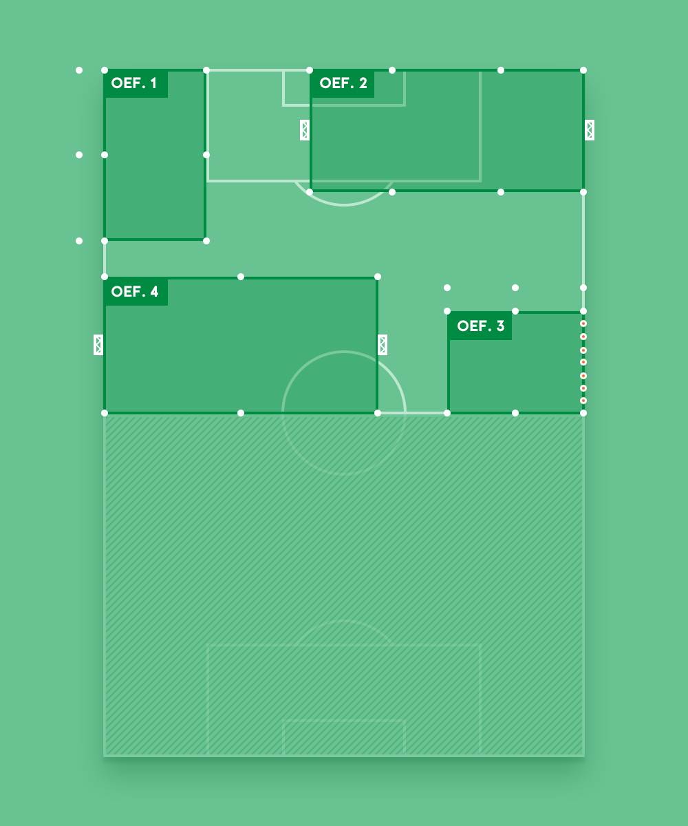 Noteer de afmetingen van de veldjes en maak groepen van minimaal 8 spelers. Na een centraal eindsignaal, draaien alle groepen met de klok mee naar de volgende oefening.