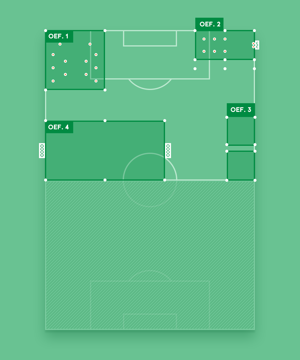 Noteer de afmetingen van de veldjes en maak groepen van minimaal 8 spelers. Na een centraal eindsignaal, draaien alle groepen met de klok mee naar de volgende oefening.