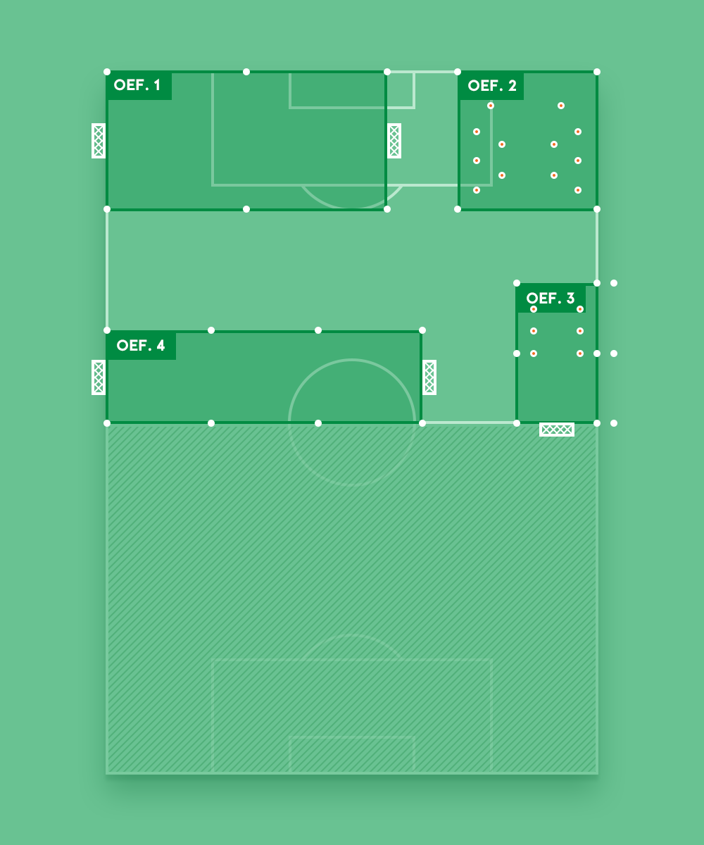 Noteer de afmetingen van de veldjes en maak groepen van minimaal 8 spelers. Na een centraal eindsignaal, draaien alle groepen met de klok mee naar de volgende oefening.