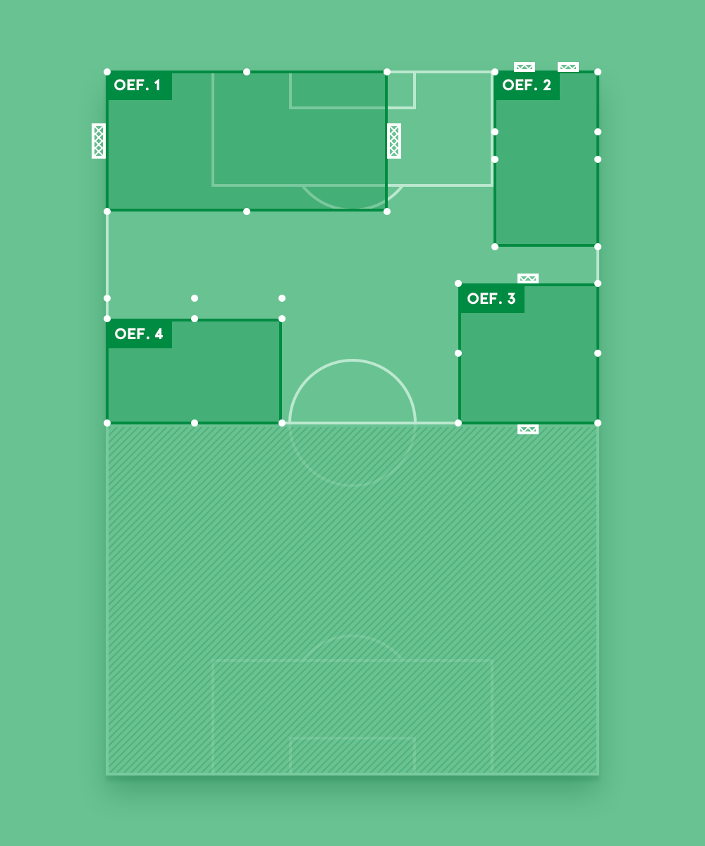 Noteer de afmetingen van de veldjes en maak groepen van minimaal 8 spelers. Na een centraal eindsignaal, draaien alle groepen met de klok mee naar de volgende oefening.