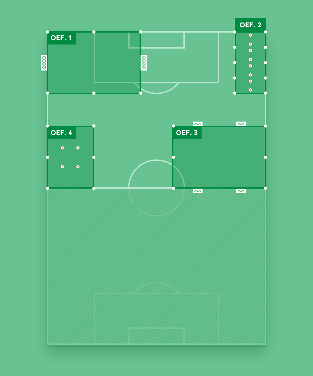 Noteer de afmetingen van de veldjes en maak groepen van minimaal 8 spelers. Na een centraal eindsignaal, draaien alle groepen met de klok mee naar de volgende oefening.