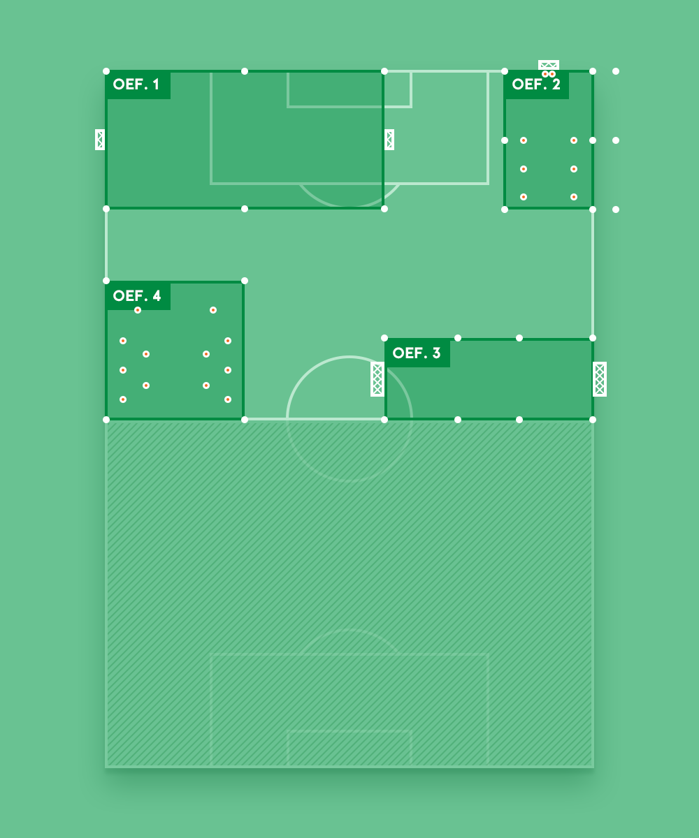 Noteer de afmetingen van de veldjes en maak groepen van minimaal 8 spelers. Na een centraal eindsignaal, draaien alle groepen met de klok mee naar de volgende oefening.