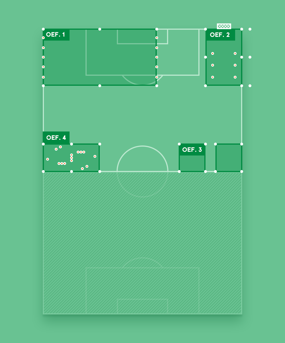 Noteer de afmetingen van de veldjes en maak groepen van minimaal 8 spelers. Na een centraal eindsignaal, draaien alle groepen met de klok mee naar de volgende oefening.