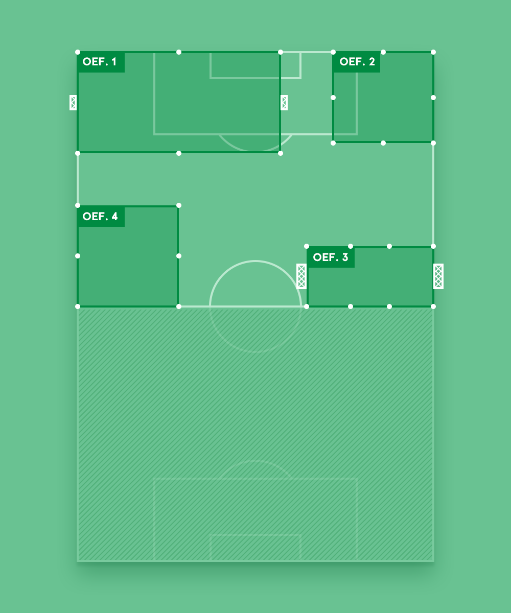 Noteer de afmetingen van de veldjes en maak groepen van minimaal 8 spelers. Na een centraal eindsignaal, draaien alle groepen met de klok mee naar de volgende oefening.